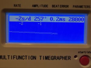 数ヶ月前より我が相棒のヴァシュロン・コンスタンタン「(初代)オーヴァーシーズ ラージ」を着用し過ごしていると、「あれれ?!なんか時間が進んでない??」まさしく進むよ進むよどこまでも・・・ということが起こりました。その際、時間を修正してしばらく着用していると時間は狂わず元の健全な姿に戻るという「あれれ?!」を繰り返ししていました。さすがに数回同じことがあると異常を感じ、時間が進む症状はまず「帯磁」が原因と考え、自宅の磁気抜き機で簡易対応。しかし直らず。重い腰をあげタイムグラファーで計測。そしたら計測不能状態をたたき出した(@_@)